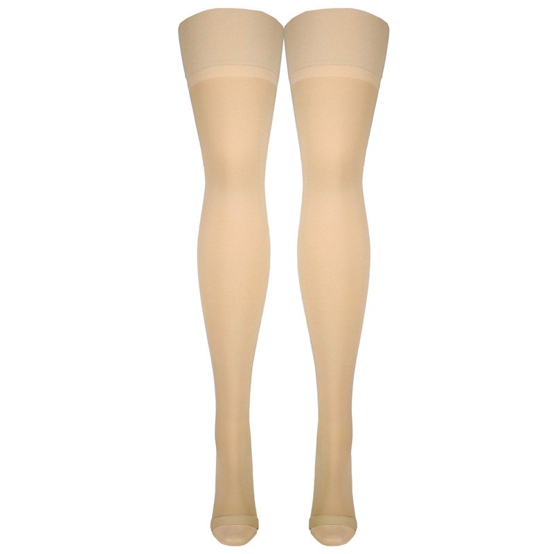 Truform 20-30 mmHg Compression Stockings for Men and Women, Thigh High Length, Open Toe, Beige, Small