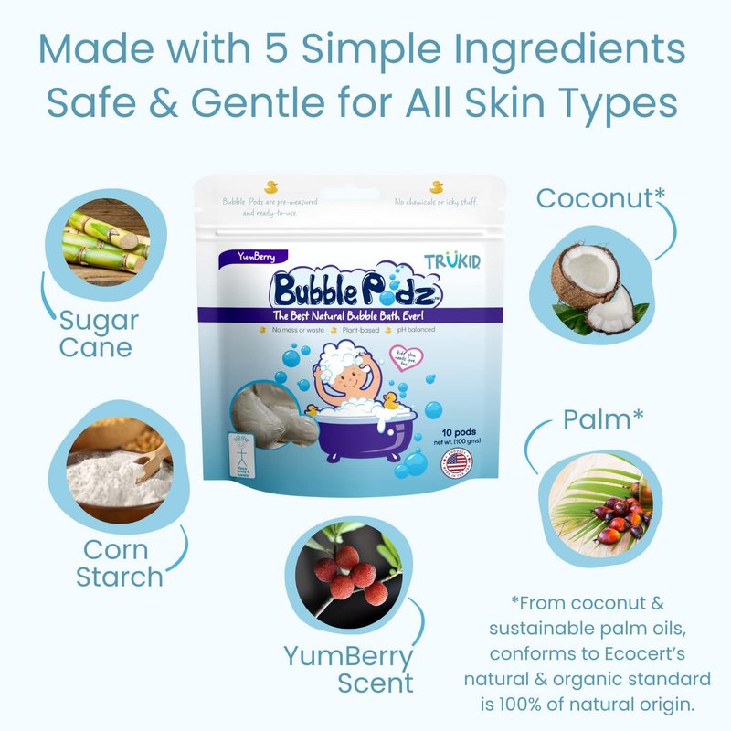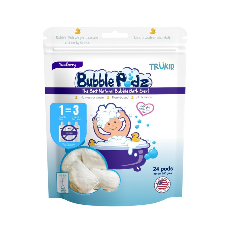 - Bubble Podz – Bubble Bath - Let your children splish and splash in a foamy, natural bubble bath from TruKid! This gentle bath formula comes in an efficient pod form and is parent-designed for sensitive skin. No-Mess, single use pod makes bubble baths so easy.