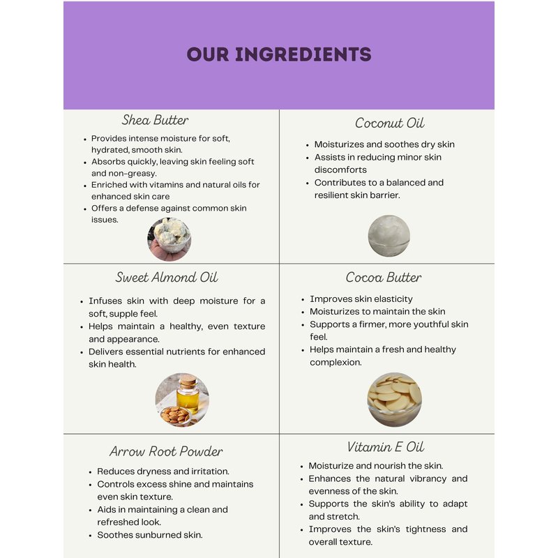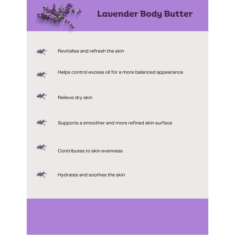 - All-in-One Skin Perfection: This Lavender Body Butter blends Raw African Shea Butter, Organic Coconut Oil, Organic Cocoa Butter, Organic Sweet Almond Oil, and Vitamin E Oil to deeply moisturize, improve skin elasticity, soothe irritation, and enhance overall skin health.