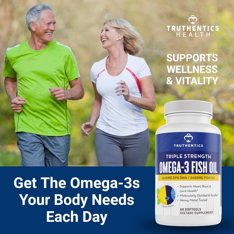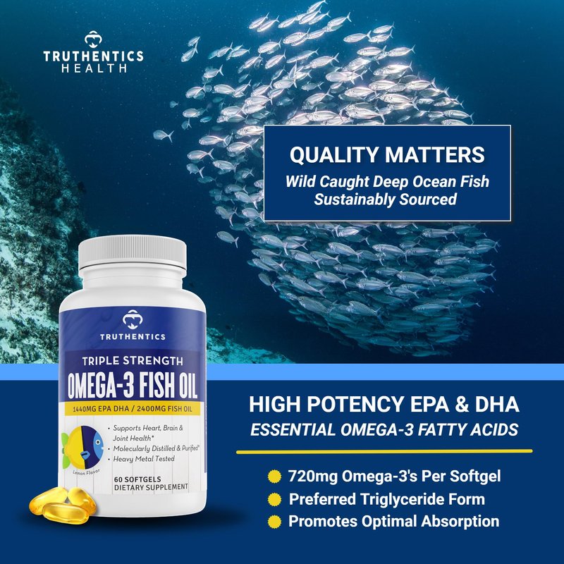 TRUTHENTICS Omega 3 Fish Oil, 2400 mg Per Serving, Triple Strength - High EPA + DHA Omega-3 Fatty Acids - Burpless Lemon Flavor Fish Oil Supplement for Men & Women - 60 Softgels