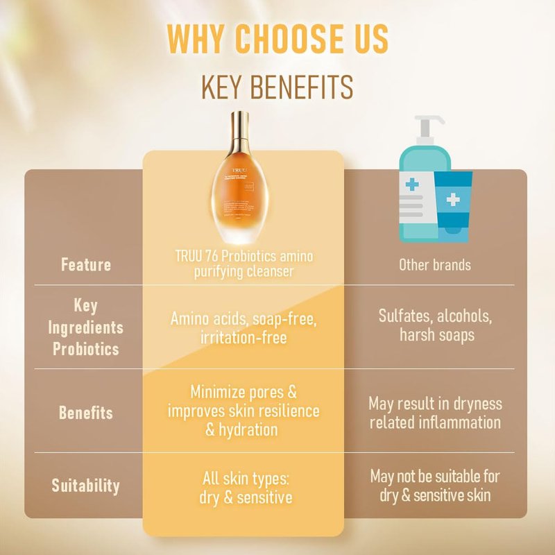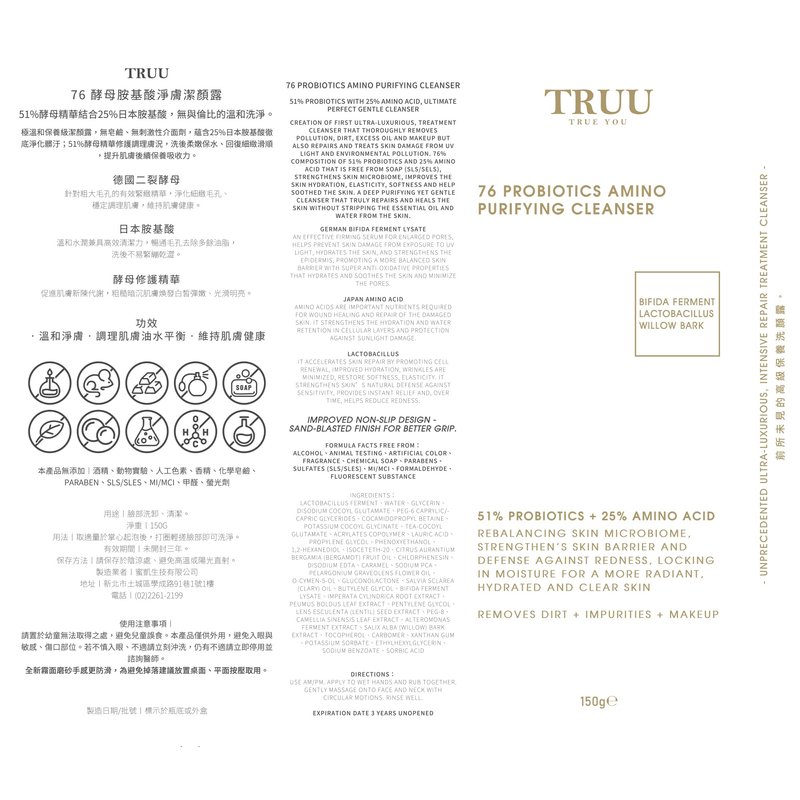 TRUU Probiotics Amino Purifying Cleanser – Ultra-Gentle Treatment with 51% Probiotics & 25% Amino Acids – Cleanses, UV Protection, Enhances Hydration & Elasticity for a Radiant, Youthful Glow | 5.3 Oz
