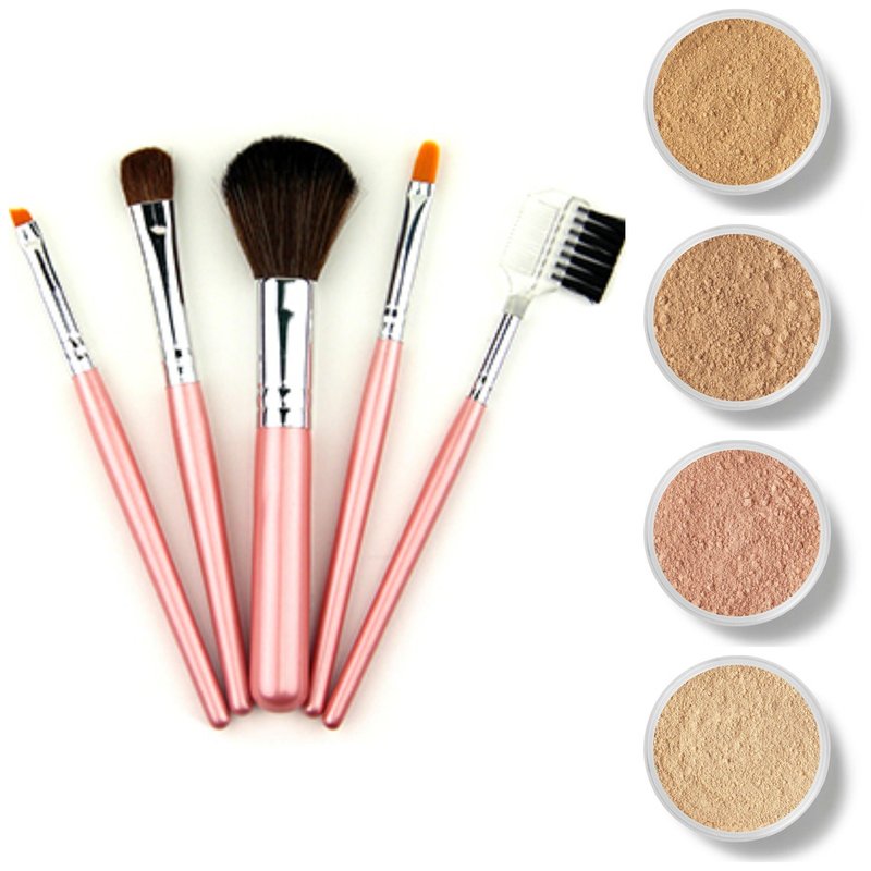 We are offering this AMAZING DEAL on our Try Me Kits! These are 5 gram jars filled with 2 grams of powder. 4 Sample Jars and 1 Sample Size Brush Set are included in this kit. Kit Includes: TWO Mineral Foundations:Sweet Face Minerals foundations are all natural and very lightweight. Our products never appear heavy or look caked and are wonderful for every skin type. Will not cause irritated itching skin or acne. Concealer: Our Concealers will offer more coverage than your foundation blend. Concealers are ideal for camouflaging imperfections and will help to neutralize the look of blemishes and dark under eye circles. Perfection Finishing Powder:This silky feather-soft powder provides weightless, breathable layering to your skin. Brush it on after your makeup has been applied. It's light and delicate and gives the appearance of perfection! Mini Pink Eco Travel Brush Set:This kit is perfect to tuck inside your purse or luggage and take on the go! Vegan, Color:Pink. 1 set of 5:Blush Brush, Eye Shadow Brush, Concealer Brush, Lip Brush and Eyelash/Eyebrow Brush.Made in the USA Animal Cruelty FreeAll Natural