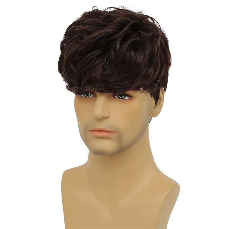 Tseses Curly Brown Wigs for Men Short Natural Layered Hair with Bangs Fluffy Men Costume Synthetic Wigs