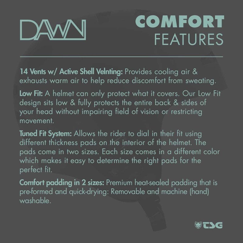 - LOW FIT & EXTENDED EAR PROTECTION: Dawn helmets offer a low-profile fit for better comfort and coverage than conventional helmets. The smart low fit design covers the entire back and sides of the heat, without any restriction on vision and mobility. TSG Dawn extends the hardshell protection down to the ears, with its retro style, classic ear protection profile from the 80s. The full-cut design stands up to the rigors of high-speed falls or high-impact slams, without getting squished.