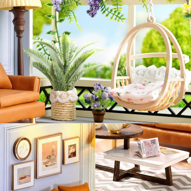 - Excellent Quality & Exquisite Designed - Materials are of excellent quality, miniature furniture and other wooden pieces are precisely cut so that they fit together perfectly. Sofa, table, hanging chair, plant, ornaments, these miniature dollhouse accessories are realistic, exquisitely and simply designed. Dust cover can protect the dollhouse from getting dirty