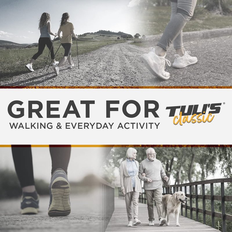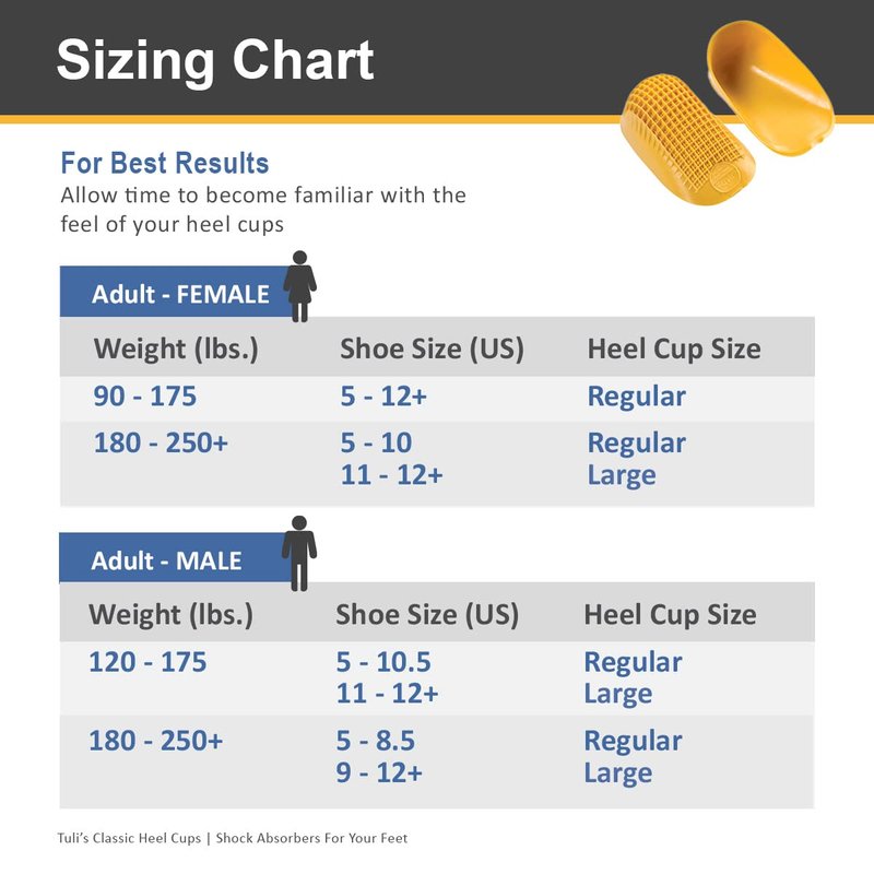 Tuli's Heel Cups are #1 Podiatrist recommended heel cups in the world. Tuli’s Classic Heel Cups are ideal for those suffering from heel pain and aching feet. The Tuli’s Classic Heel Cups work best in all shoe styles because they are supportive yet flexible enough for any shoe. You can have lightweight support and cushioning all day long for any daily activity. They are ideal for treating plantar fasciitis, Achilles tendonitis, shin splints, and general heel pain. Tuli’s Classic Heel Cups are bio-mechanically designed and have a multi-cell, multi-layer design that absorbs shock and returns impact energy just like the system naturally found in your feet. Tuli's Classic Heel Cups provide immediate heel pain relief by cushioning the area of pain and elevating the heel bone. The additional cushion and elevation you get when you use these plantar fasciitis heel cups allow you to prevent and treat problems like sore heels and shin splints. These cushioned heel cups are ideal for everyday walking, running & standing, promoting stability & proper alignment, and cradling & protecting your heels. With Tuli’s brand foot care products, we’ve scientifically duplicated the shock-absorbing design naturally found in your feet to maximize shock absorption and keep the back, feet, knees, and hips in alignment. Nothing works better or last longer than your Tuli's heel cups. For best results allow time to become familiar with the feel of your heel cups. Best worn outside of socks. Refer to the Sizing Guide for the best fit. The heel cup does not adhere to your feet – Should be worn with shoes. Fits in almost any shoe.