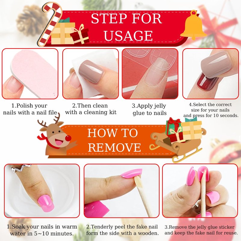 - 🎄【Easy to use】Just choose the nail piece that suits you, polish the nail bed, paste the jelly glue we give you, and then press the nail for 30 seconds to get your favorite Xmas style nail. Due to the limited use of jelly glue, we suggest you use your own glue.