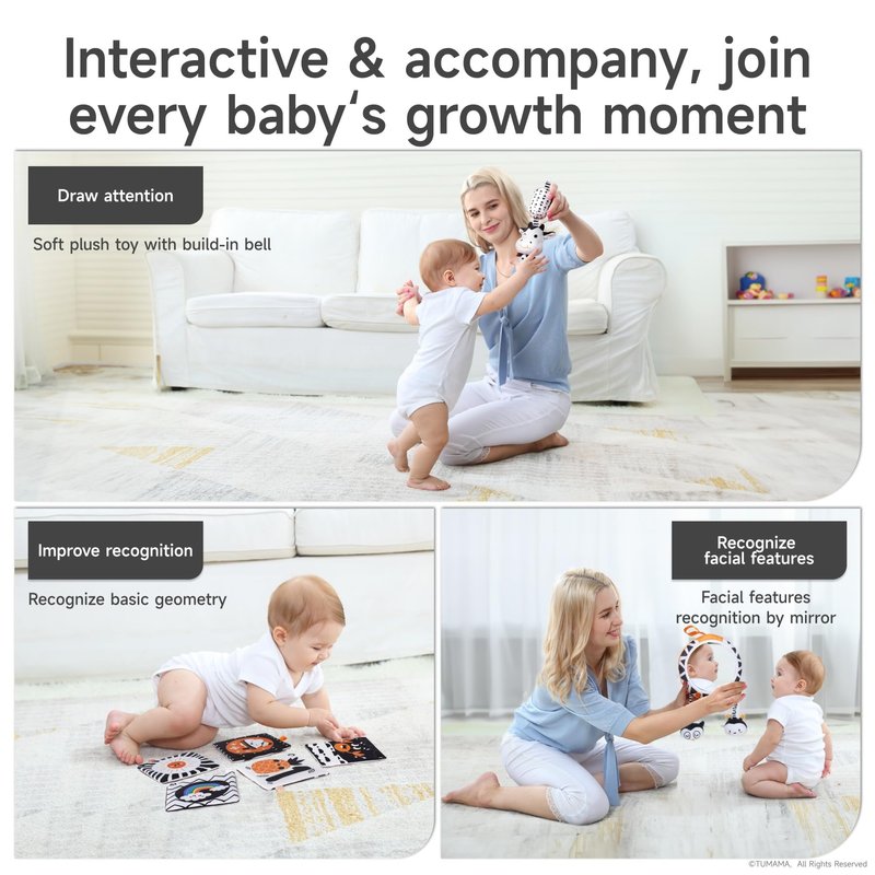 - Visual Stimulation for Newborn :The high contrast baby toys set features 0-12 months infants and to stimulate baby's vision and cognitive development,they are sensitive to black and white color. The mirror is made of acrylic, it is resistant and 180 degree bend without crease.