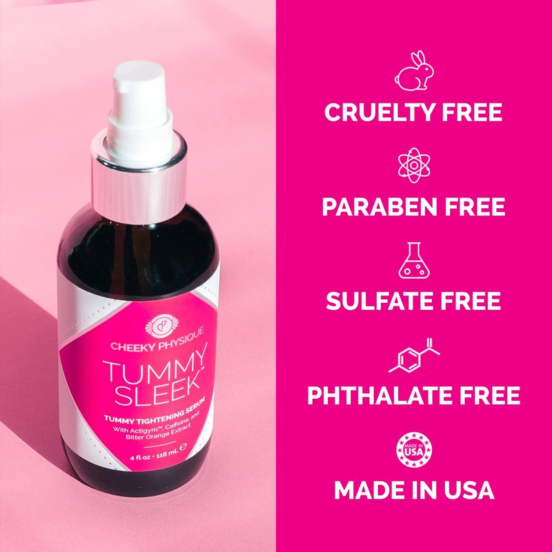 Boost belly confidence with Tummy Sleek! Tummy Sleek Tummy Tightening Serum is the perfect solution to improve the appearance of loose skin and cellulite on the abdomen. Why? SMOOTHS & TIGHTENS SKIN - Achieve those flat belly goals with the help of our innovative skin tightening cream for the stomach. Tummy Sleek contains a trio of skin-toning ingredients to help firm the appearance of the tummy area. FIRMER LOOKING BELLY - Powerful ingredients including caffeine, Actigym marine extract, and bitter orange extract noticeably firm and smooth skin for a sleeker and tighter looking belly. IMPROVES SKIN ELASTICITY - This lightweight, fast-absorbing serum sinks in quickly to hydrate skin, restore the look of elasticity, and visibly improve skin texture. POWERFUL FIRMING INGREDIENTS - The clinically tested ingredients promote a more taut and toned looking belly. Combined with a healthy diet and exercise, it's our secret weapon for a tighter-looking tummy and an extra boost of confidence! MADE IN USA - Cheeky Physique products are made in California, USA using only the best ingredients. Our cruelty-free products are formulated without parabens, phthalates, sulfates or mineral oil. HOW TO USE TUMMY SLEEK: Apply a thin layer twice daily and massage until fully absorbed. After achieving the desired results, we recommend applying Tummy Sleek 3-4 times per week to help maintain a taut and toned silhouette. KEY INGREDIENTS Actigym Marine Extract - An ingredient derived from marine plankton extract, Actigym is clinically shown to improve skin tone and tighten the look of the belly area. Caffeine - Known for its depuffing effects, caffeine visibly smooths and tightens skin for a more defined look. Bitter Orange Extract - An antioxidant-rich citrus extract that helps rejuvenate skin to improve the skin’s tone and texture.