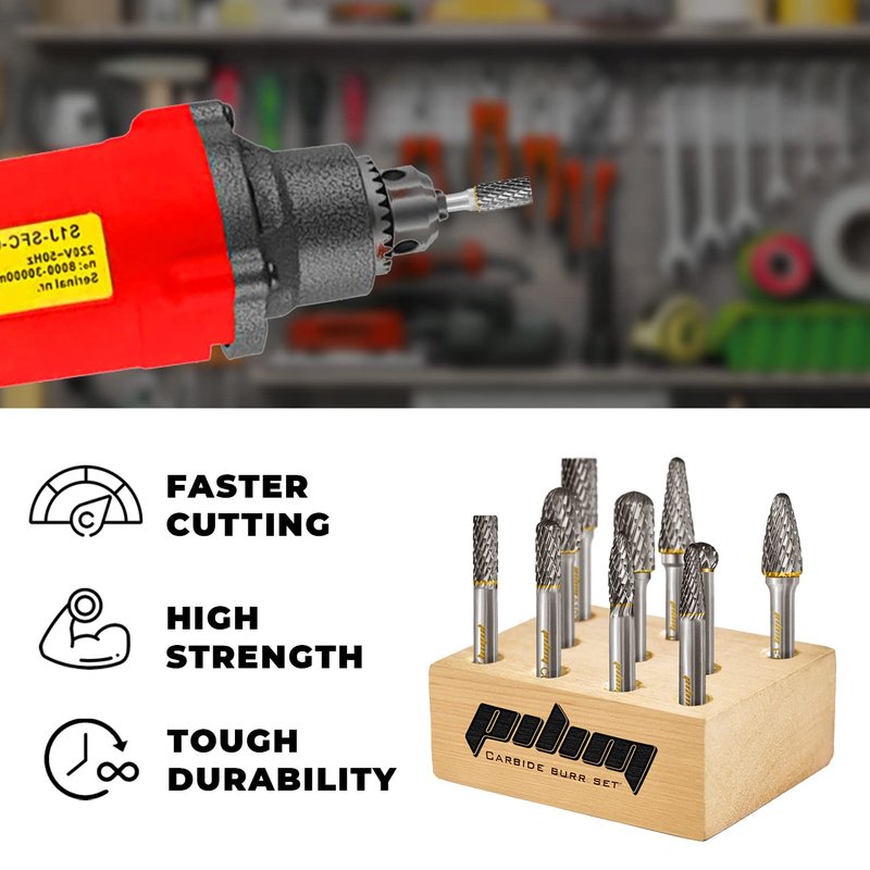 Tungsten Carbide Burr Set 1/4" Shank 10PC Double Cut Rotary Cutting Burrs Die Grinder Bits for Steel and Wood Working, Grinding, Carving, and Engraving