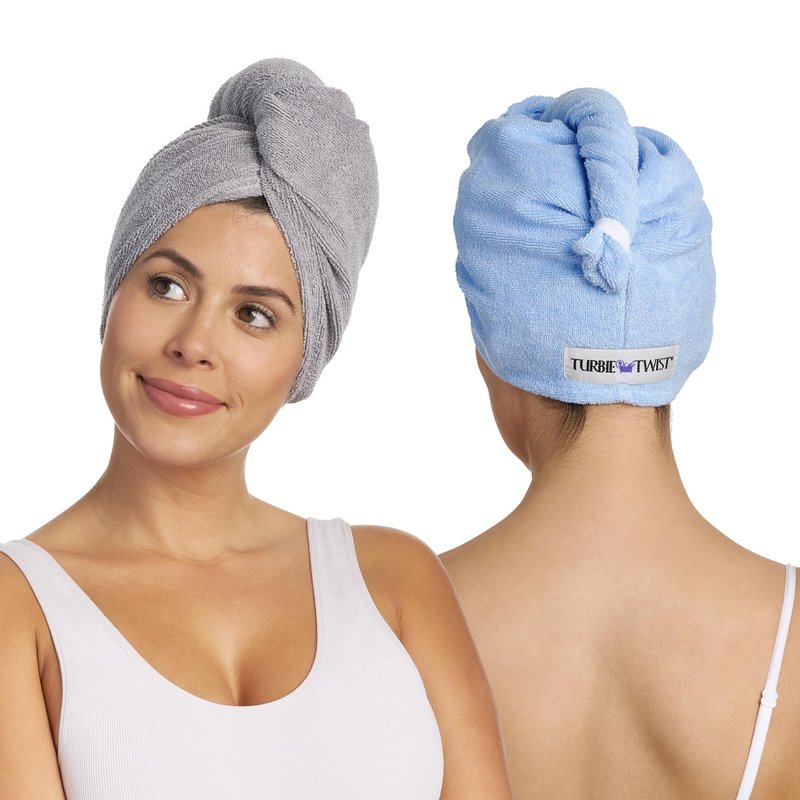 Turbie Twist 2-Pack Microfiber Hair Towel for Beauty, Travel, Gifting - Hair Wrap Turban for Straight, Wavy & Curly Hair - Premium Hair Care - Grey & Blue