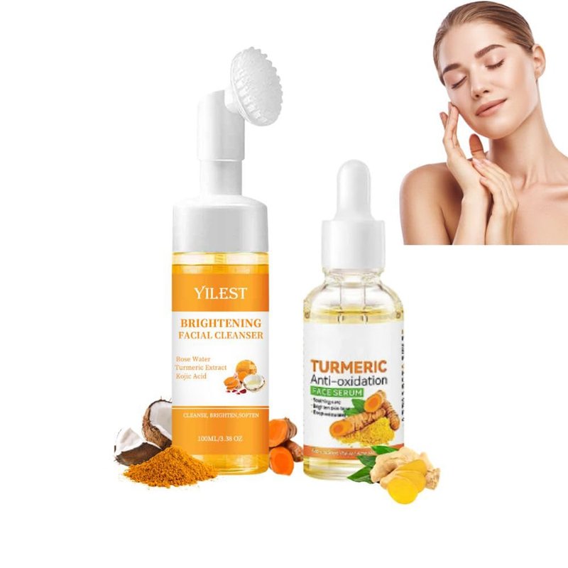 Turmeric Face Wash & Turmeric Face Serum Set, 2 PCS Turmeric Facial Foaming Deep Cleansing Exfoliating, Turmeric Serum for Moisturizing Skin, Multi-Purpose Turmeric Cleanser & Serum for All Skin