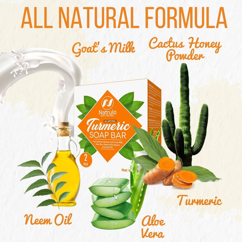 - CLEANSING & BRIGHTENING: Enriched with turmeric powder & aloe vera, this natural soap bar deeply cleanses skin of impurities but also gradually fades the appearance of scars, spots & sun damage so that it glows bright.