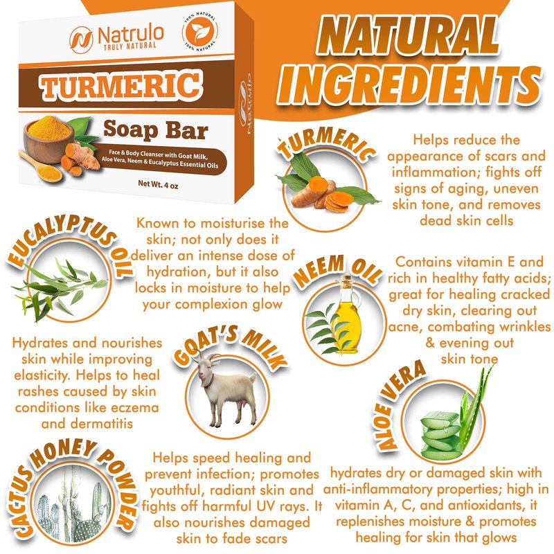- PURE & NATURAL SKINCARE: Handmade in the USA to help treat dull, damaged, itchy, inflamed & acne-prone skin, this skin brightening soap contains rich goat's milk, turmeric honey, neem, eucalyptus & aloe vera.