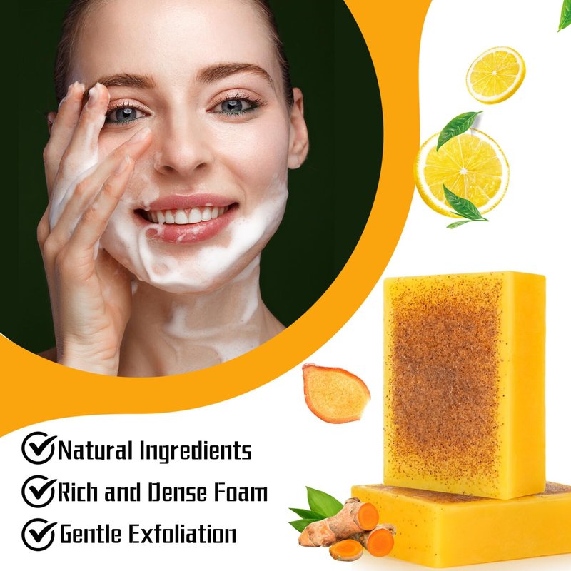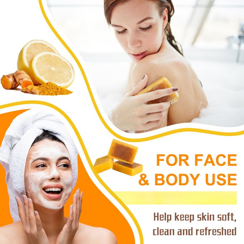 - 【Antioxidant & Moisturzing】 Turmeric and lemon are rich in natural antioxidants that have significant anti-aging benefits; These body soap bars work to minimize the appearance of fine lines and wrinkles, providing a smoother, more refined texture to the skin; This face soap helps strengthen the skin's barrier function and locks in precious moisture from loss