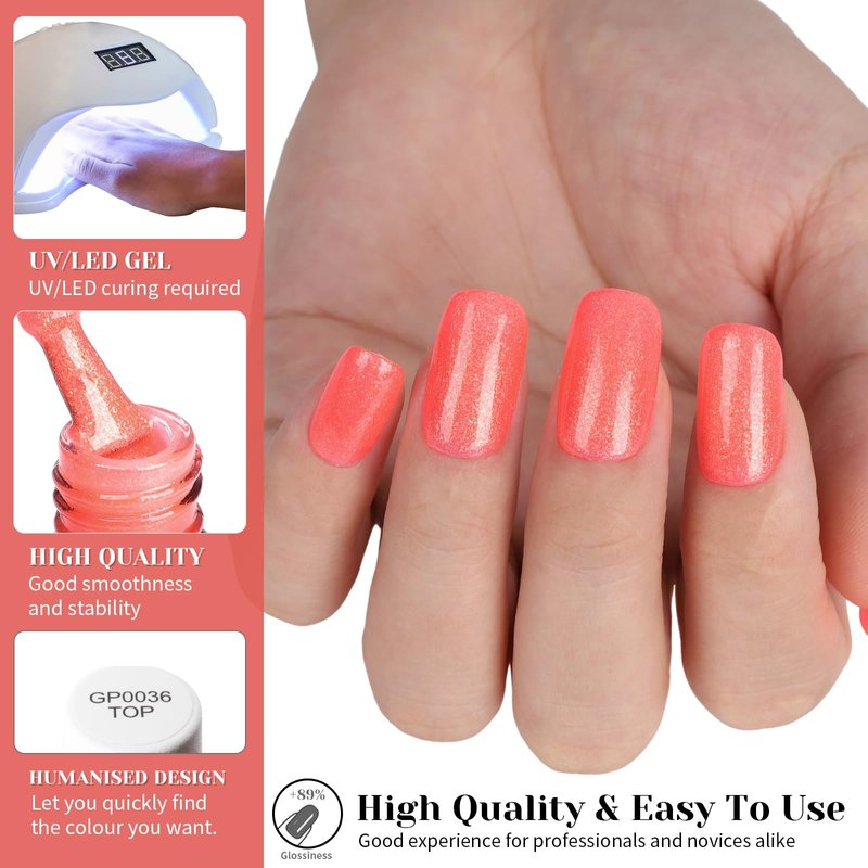 - Easy application: The smooth and creamy texture of this sparkly hot coral pink gel nail polish makes it effortless to apply, providing even coverage and minimizing the chances of streaks or clumps.