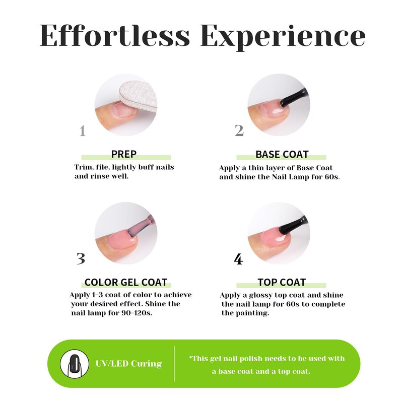 - Easy Application and Fast Drying: Applying our gel nail polish is a breeze. The smooth consistency ensures effortless application, while the UV light quickly sets and dries the polish, saving you precious time. Get ready to show off your stunning nails in no time!