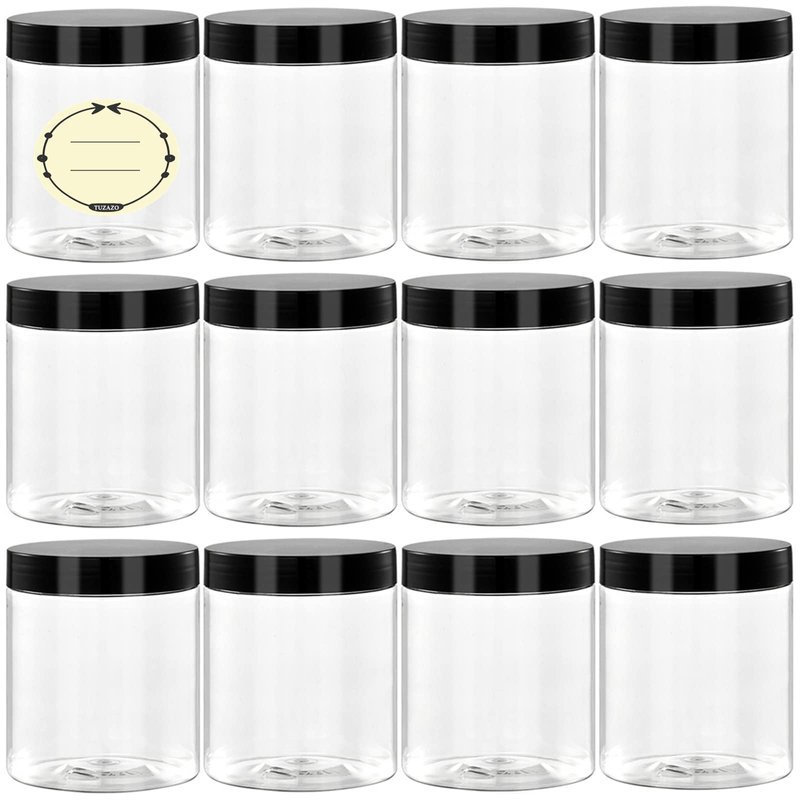 TUZAZO 8 Oz Plastic Container Jars with Lids and Labels BPA Free, Empty Round Clear Cosmetic Containers Plastic Slime Jars for Lotion, Cream, Ointments, Body Butter, Makeup, Travel Storage (12 Pack)