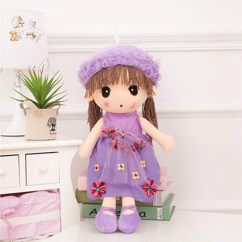 The Tvoip Phyllis doll is made with soft material, making her ideal to cuddle with. She comes with a purple cute dress, brown hair ,embroidered face, and a purple hat.