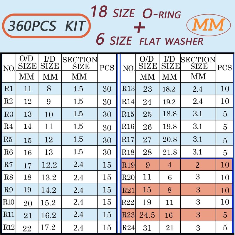 - {O RING SIZE}: Oring kits 18 size OD:11mm, 12mm, 13mm, 14mm, 15mm, 16mm, 17mm, 18mm, 19mm, 20mm, 21mm, 22mm, 23mm, 24mm, 25mm, 26mm, 27mm, 28mm.