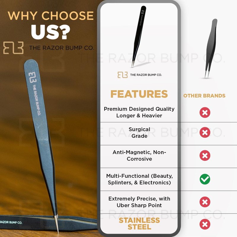 Tweezers For Ingrown Hair By The Razor Bump Co. | Sharp, Stainless Steel, Surgical | Professional Tweezers For Women and Men | Precision Splinter Remover | Best Facial Hair and Eyebrow Trimmer | Black