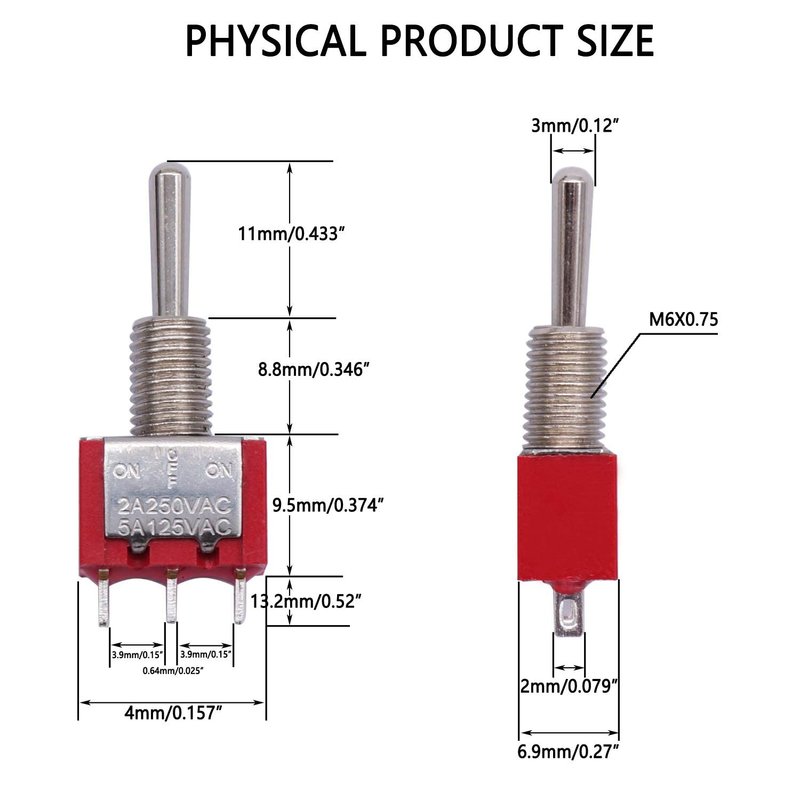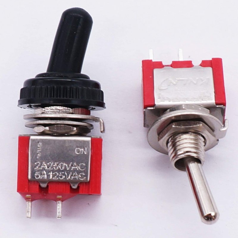 Mini Toggle Switch Can be used on low voltage or high voltage circuits ideal for switching lights or motors. Each switch comes with two hex nuts, a flat and a locking washer. Easy installation. Fit 6mm hole is required and the switch will sit in nicely.