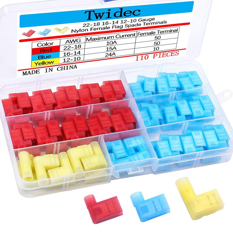 Twidec/110Pcs Nylon Flag Spade Female Insulated Terminals 22-18 18-14 12-10 Gauge Quick Disconnects Electrical Crimp Terminals Connector Assortment Kit for Electrical Wiring Car Audio Speaker N-006