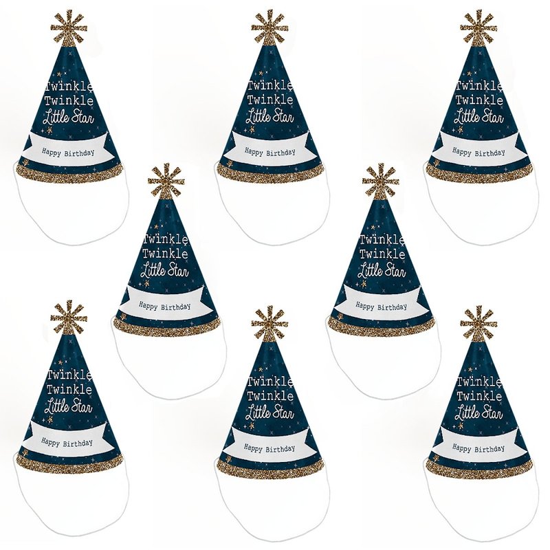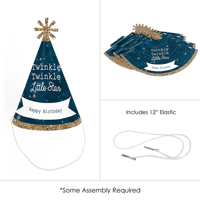 - Twinkle Twinkle Little Star Party Hats INCLUDES 8 cone-shaped twinkle little star party hats for adults with decorative top and elastic chin straps. Twinkle Twinkle Little Star party hats are a larger size but will fit both children and adults. Some easy and quick assembly required.