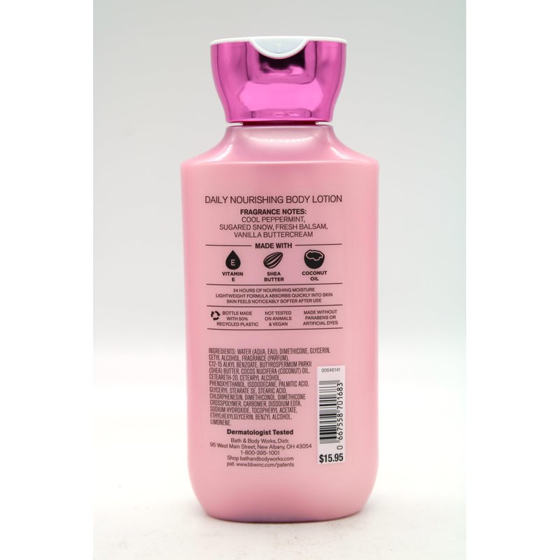 Fragrance Name: Twisted Peppermint / Fragrances Notes: Cool Peppermint, Sugared Snow, Fresh Balsam, Vanilla Buttercream / Size: 8 fl oz (236 mL) / Made with Vitamin E, Shea Butter, Coconut Oil / Not Tested on Animals & Vegan / Dermatologist Tested / Made without Parabens or Artificial Dyes