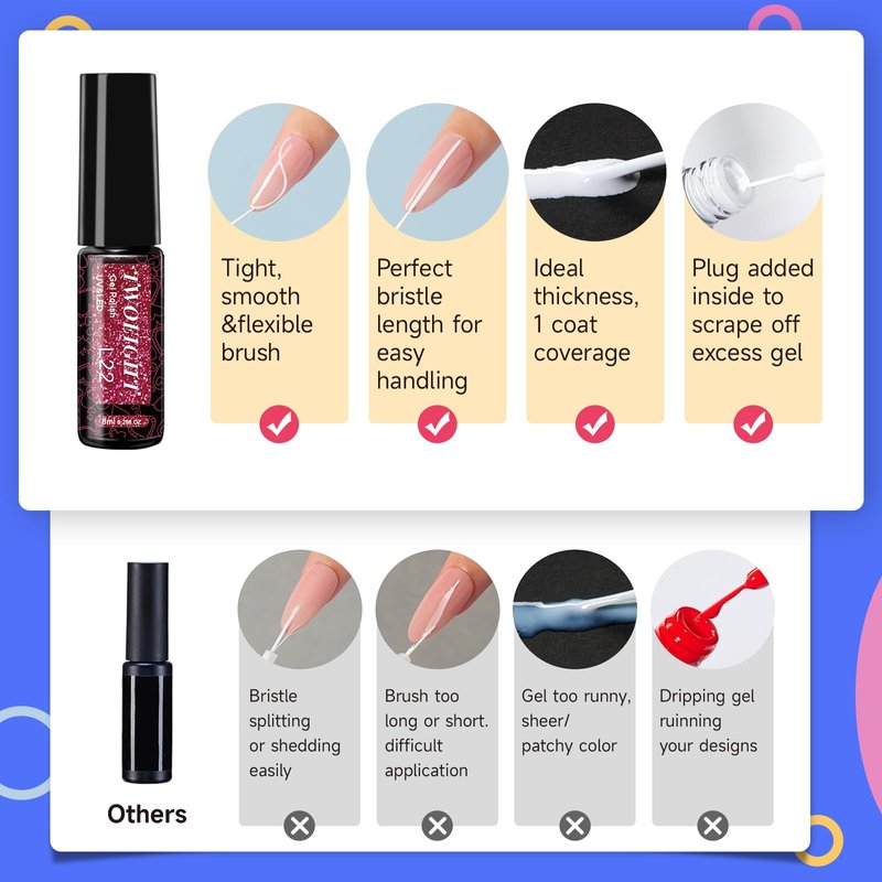- 【FINE THIN BRUSH】Each bottle comes with brushes to keep the color neat and clean. The brush is thin, smooth and flexible, able to draw delicate lines with the sharp tip and to color the whole nail with the tilted side. You can trace, fill, outline, draw waves, lines, French styles, painting with the nail pen brush. Everyone can be nail artist at home.