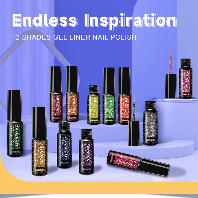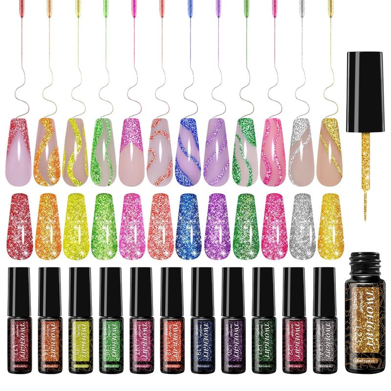 TWOEIGHT Gel Nail Polish Liner Nail Art 12 Colors 8ml Reflective Glitter Gel Flash Diamond Painted Polish Gold Silver Pink Gel Kit Soak Off UV Nail Art Design Set DIY Manicure Gifts for Women