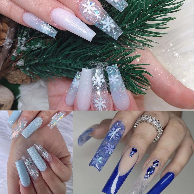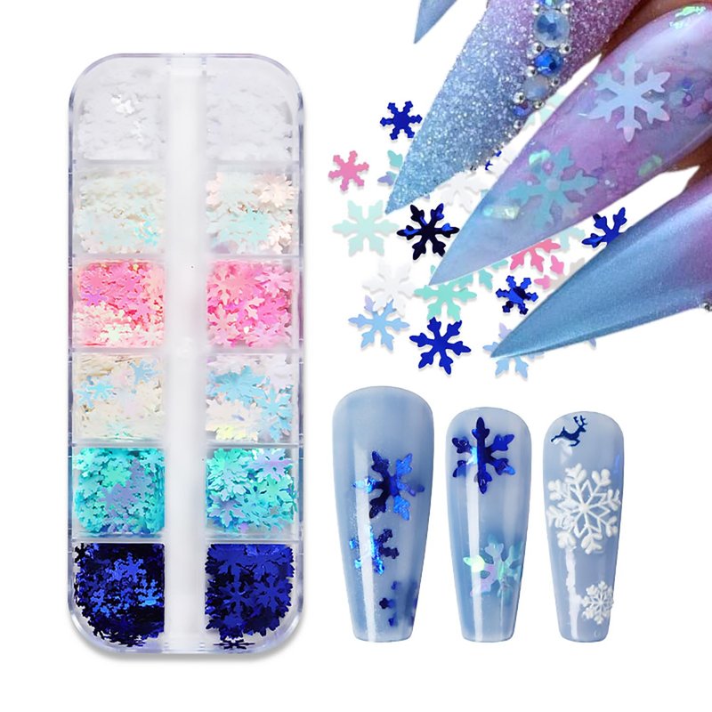 - Christmas Nail Decorations: You will get 1 box 12 grids snowflake glitter pieces(Include white blue pink green designs nail glitter flake), each nail decal is individually packaged in a container, allowing you to easily DIY unique Xmas nail decorations at home