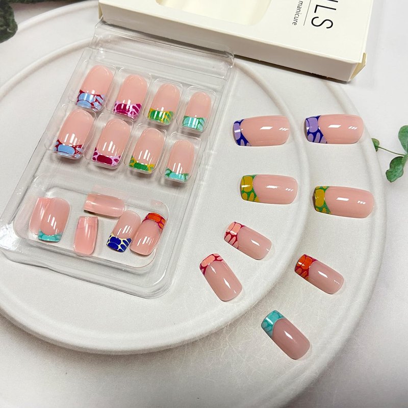 - 【Easy to Use】: Choose the suitable colorful french tip fake nails, polish the nail bed, paste the jelly glue we give you, press the fashion nail art in 30 seconds, and create the nail art that girls like,If the size is not suitable, it can be polished to the size of the nail cap with a friction tool.