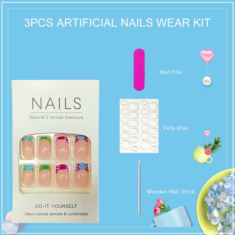 - 【French Tip Glue on Nails Kit】: There are 24pcs of medium square artificial finger nails 12different sizes, 1 mini nail file, 1 small wooden stick, 1 nail sticker in the package.(Jelly glue doesn't last as long as liquid glue, but it can make fake nails reusable. Please use suitable glue according to different occasions).