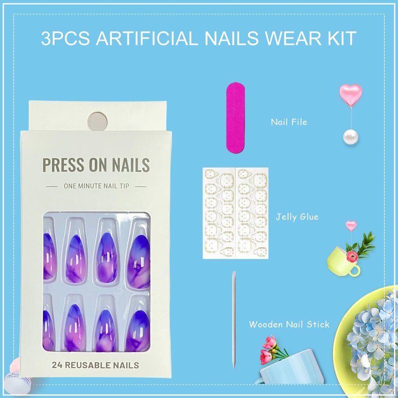 - 【Purple Glue on Nails Kit】: There are 24pcs of medium almond artificial finger nails 12different sizes, 1 mini nail file, 1 small wooden stick, 1 nail sticker in the package.(Jelly glue doesn't last as long as liquid glue, but it can make fake nails reusable. Please use suitable glue according to different occasions).