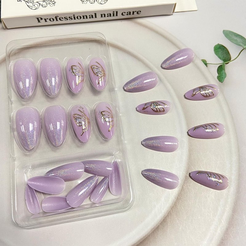 Tyuimhx Purple Press on Nails Medium Almond Fake Nails Glitter False Nails with Gold Butterfly Designs Full Cover Stick on Nails Acrylic Artificial Nails for Women Girls Glue on Nails 24Pcs