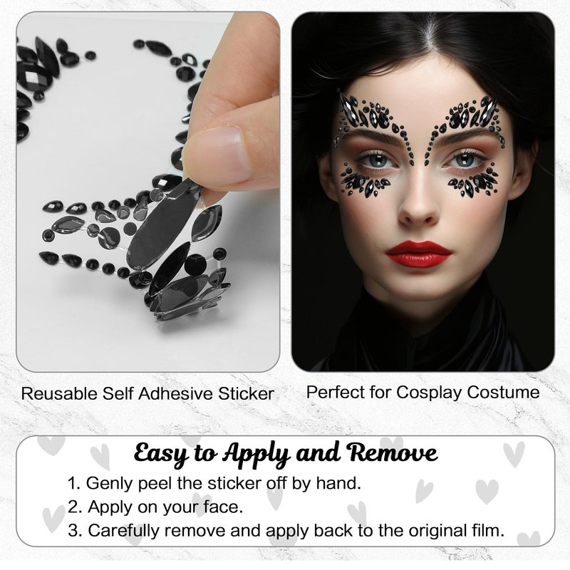 - Self-adhering & Easy to apply - The Halloween face gems come with an adhesive back, which is convenient to use, face gems with glue just peel them off the sheet, and black face jewels stick on the face, easy to peel off and stick on, with no need for any glue. (Please make sure your face is dry before sticking the crystal face jewels.)