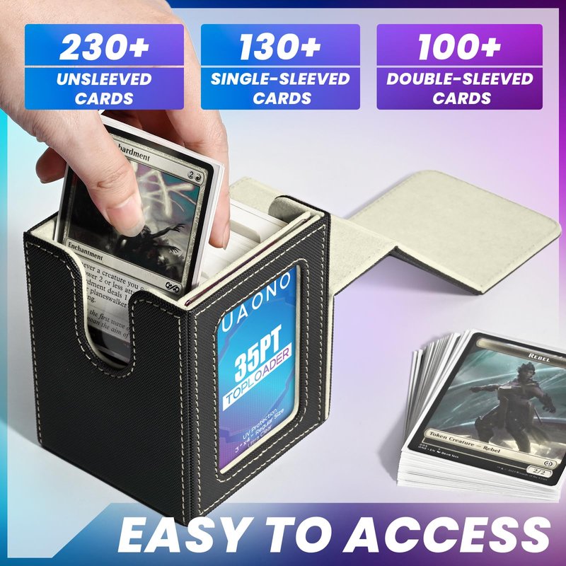 - ๐ฃ๐ฒ๐ฟ๐ณ๐ฒ๐ฐ๐ ๐๐๐ผ๐ฟ๐ฎ๐ด๐ฒ ๐๐ฝ๐ฎ๐ฐ๐ฒ - The UAONO card storage box can hold 100+ double-sleeve cards, 130 single-sleeve cards, or 230+ unsleeved cards. Its U-shaped wide mouth opening and flip-cover design allow for easy retrieval of your cards, ensuring smooth and hassle-free gameplay.