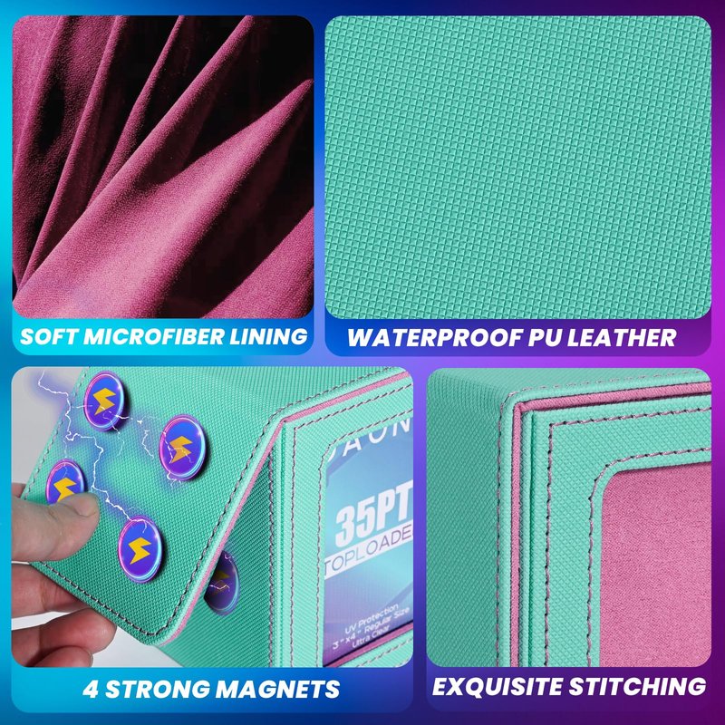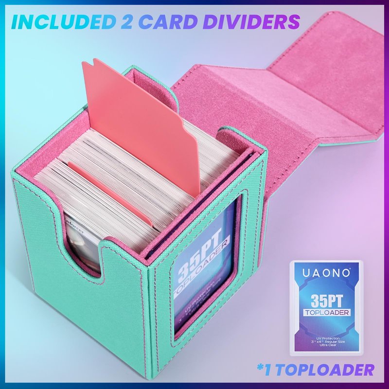 UAONO Card Deck Box with MTG Commander Display, Patented Design Card Deck Case Holds 100+ Double-Sleeved Cards, PU Leather Cards Storage Box For TCG with 2 Dividers, 1 Toploader (Turquoise&Pink)