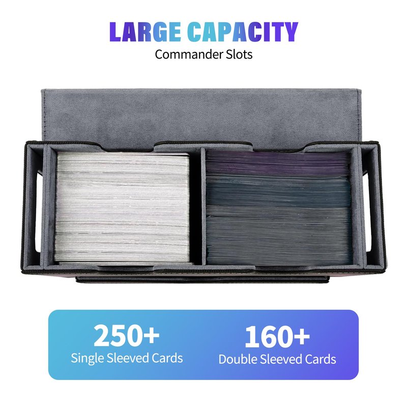 - Ample Capacity: tested with various popular card sleeves, the upgraded commander card case boasts an impressive capacity. It fits 250+ single-sleeved cards. The spacious dice tray design helps you to store your dice, ensuring all your gaming essentials are neatly organized and within reach