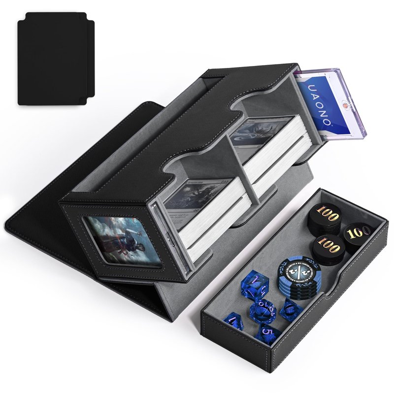 UAONO MTG Deck Box with 2 Commander Display and Dice Tray-Patented Design, Double Deck Box for 250+ Single Sleeved Cards, Leather Magnetic Card Storage Box Fits for TCG CCG Magic Cards (Black&Gray)