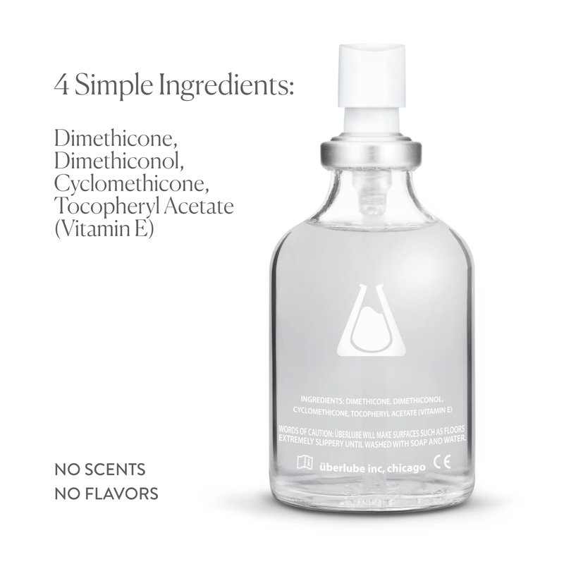 Uberlube is a personal lubricant intended to moisturize and lubricate, to enhance the ease and comfort of intimate sexual activity and supplement the body’s natural lubrication. Uberlube is a registered medical device with FDA, CE, CCN, ARTG. Uberlube is silicone with a trace of vitamin E to improve the finish and leave a smooth sensation. Uberlube is cruelty free with no animal products and vegan friendly. No alcohol, no gluten, no glycerin, no parabens, no scents and flavors. Uberlube is compatible with natural rubber latex and polyisoprene condoms. Uberlube is not compatible with polyurethane condoms. Uberlube may interact with silicone including hard plastic silicone. To know for sure try uberlube on a small area. Clean after use for best results. 4 Simple Ingredients: Dimethicone, Dimethiconol, Cyclomethicone, Tocopheryl Acetate (Vitamin E).