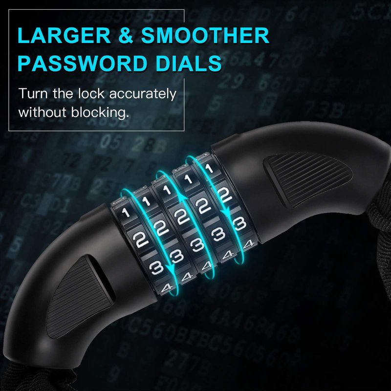 - HUMANISED DESIGN: The smooth lock head of this bike chain lock is made of PE plastic which helps you turn the lock accurately without blocking. The combination bike lock comes with a flexible protective cloth sleeve which can protect the bike from scratch.