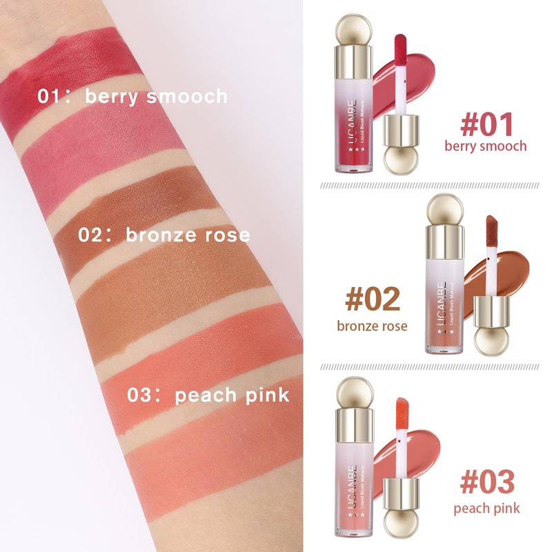 - 【3 SHADES FACE BLUSH】UCANBE Water-Based liquid blush bring comfortable and amazing color kisses to cheeks. Slide on the skin, leaving a soft and dewy effect. Soft and smooth texture, easy to mix, creating a natural and charming makeup look