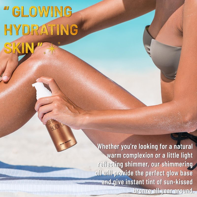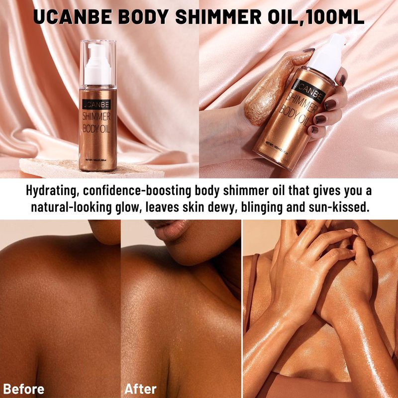 - 【UCANBE 100ml Shimmer Body Oil Glowing Luminizer】This shimmering body glow oil made to top off your natural-looking healthy glow and brightens your complexion, the flecks of shimmer catch the light and make your skin shine, get you instant bronze skin look with some glitter, giving skin an attractive shimmer in the sun. Definitely a must-have for girls and women to keep their skin hydrating and glowing all year 'round!