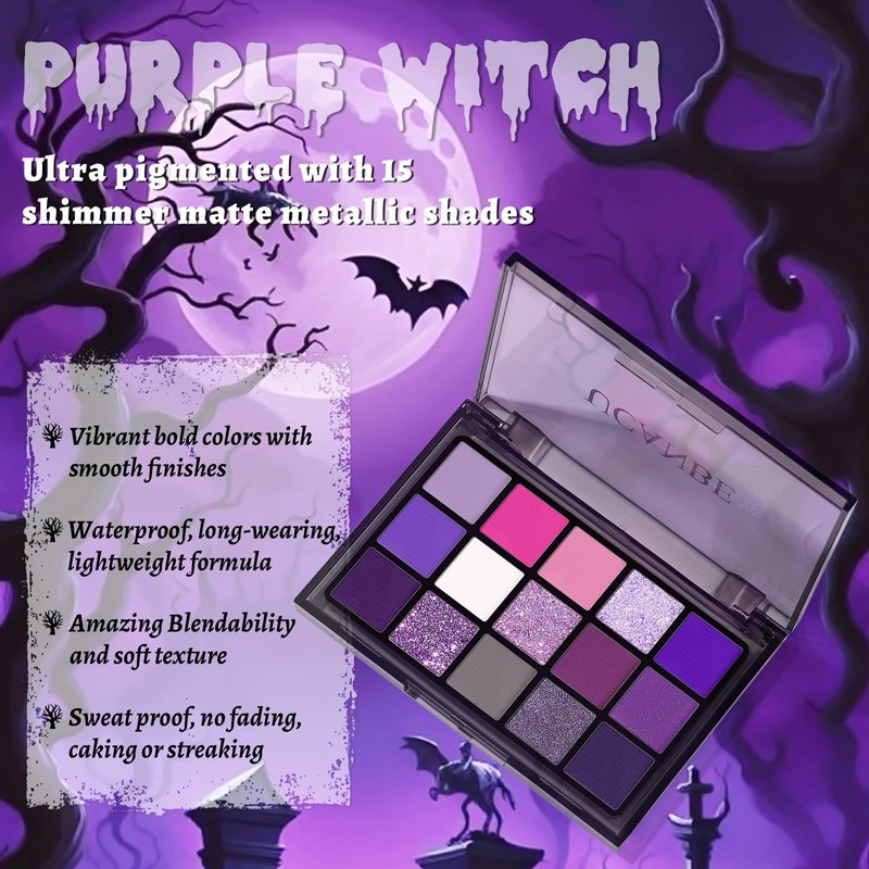 - ❤. This Purple Witch eye palette is mixture of 15 stunning purple-hue shades that velvety & go on smoothly texture with matte satin finishes to create next level looks to unleash your artistry. Each blendable, buildable and long-lasting, created to suit every skin tone and eye color.