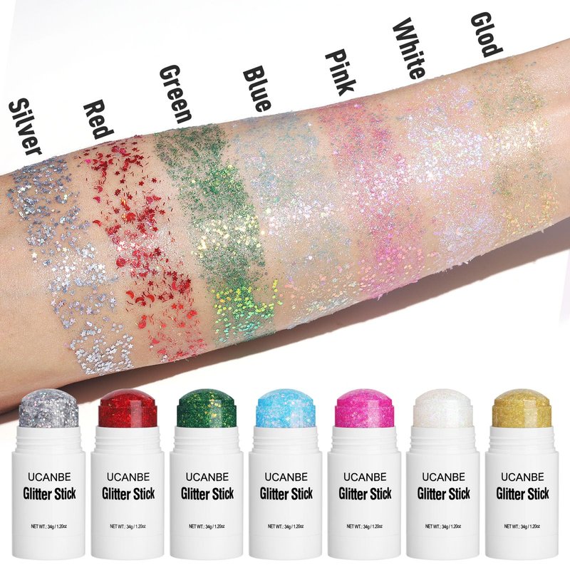 - Vibrant 7-Color: Green, pink, gold, blue, red, silver, and white body glitter—perfect for creating stunning, eye-catching looks. Whether you're going for a bold festival look or adding a touch of sparkle to everyday wear.
