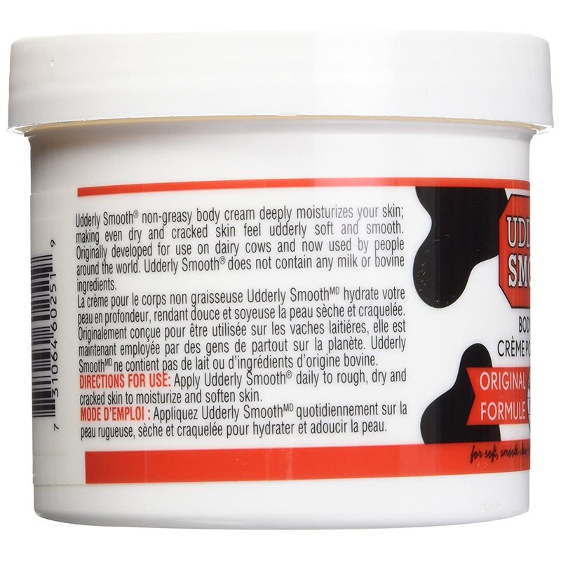 - UDDERLY SMOOTH BODY CREAM in the original, non-greasy, lightly scented moisturizing formula for use on hands, feet, knees, elbows & face to help moisturize, hydrate, replenish & care for your skin so instead of being chapped & dry, it feels udderly smooth.