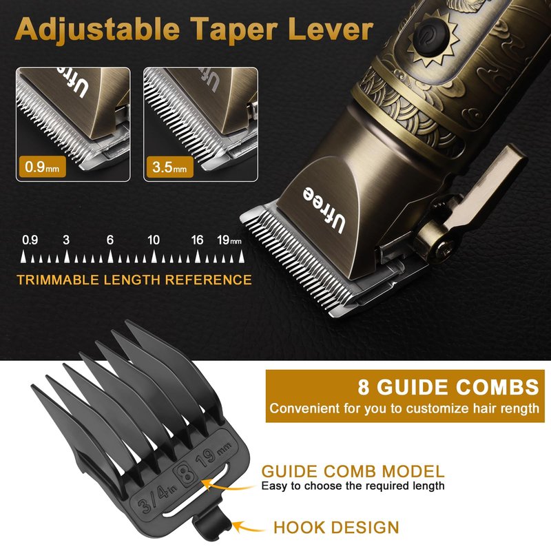 Hair trimmer equipped with T-blade canachieve zero gapped trimming and working with a guide comb can make it convenient for you to customize the trimming length of your hair.