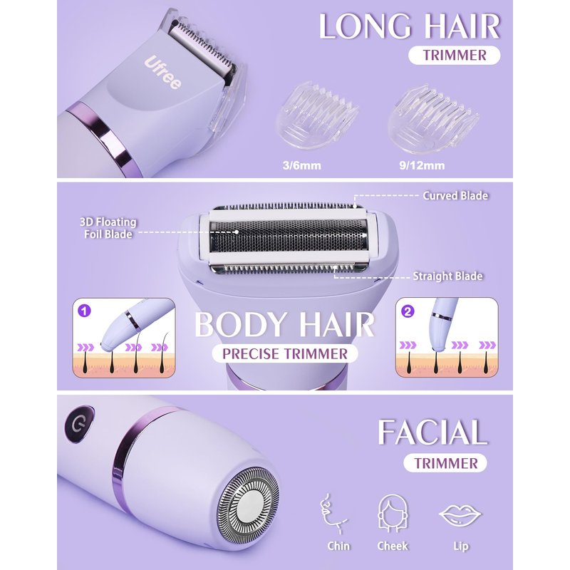 Ufree Womens Pubic Hair Trimmer, Body & Facial Hair Electric Razors for Women, 3 Interchangeable Heads, Long Battery Life Valentines day gifts for her
